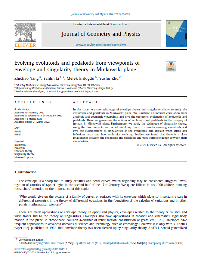 近日,学院本科生学术成果《Evolving evolutoids and pedaloids from viewpoints of envelope and singularity theory in Minkowski plane》在《Journal of Geometry and Physics》发表,该文第一作者为数学与应用数学(师范)181班杨智超同学,通讯作者为学院青年教师李彦霖副教授。该论文从奇点理论和包络理论的视角去研究 pedaloids 和 evolutoids 的性质以及彼此之间的关系,研究视角独特,研究方法新颖。研究过程中主要的困难和障碍来自于研究对象的奇点和类光点,我们利用奇点理论和包络理论等数学工具克服以上困难和障碍,并给出闵可夫斯基平面上pedaloids和evolutoids的奇点性质和他们之间的关系。
