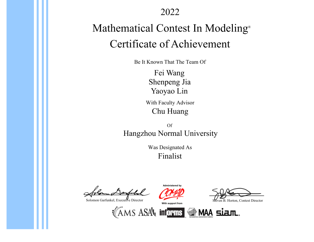 近日,2022年国际大学生数学建模竞赛(MCM/ICM)结果揭晓,我校学子在电子竞技博彩 数学建模教学团队的指导下积极进取,克服疫情造成的各种困难取得了可喜的成绩。本次比赛共有4支队伍获得F奖(特等奖提名奖),该奖项为我校在数学建模国际赛中首次突破。另有 6 支队伍获得M奖(一等奖),28 支队伍获得H奖(二等奖)。国际大学生数学建模竞赛近年来学生参与热情高、参与面广,此次参赛学子主要来自电子竞技博彩 、经亨颐教育学院、物理学院、信息科学与技术学院、经济学院、阿里巴巴商学院、外国语学院等学院。