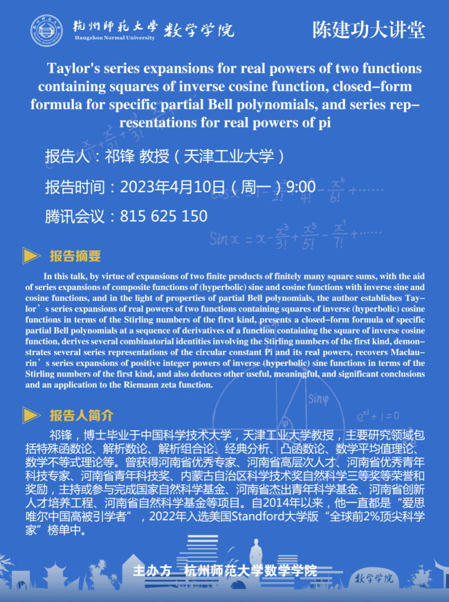 陈建功大讲堂:Taylor's series expansions for real powers of two functions containing squares of inverse cosine function, closed-form formula for specific partial Bell polynomials, and series representations for real powers of pi
